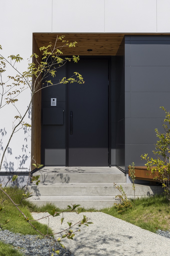 緑に映える白いシンプルな箱型の平屋。周辺環境に馴染むようグレーのアクセントウォールを採用しながら、高低差のある土地に凛とした姿でたたずむ。