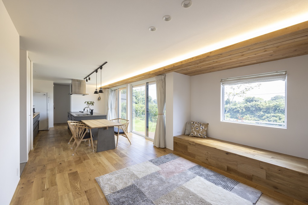 南に向いてワイドな開口を持つLDK。このラインを強調するように窓際を板張りの下がり天井にして間接照明を仕込んだ。軒下まで同じ仕上げにすることで室内外を曖昧につなげている。リビング一面は壁の一部をくり抜いたようにベンチとピクチャーウィンドウを設置した気持ちのいい空間。