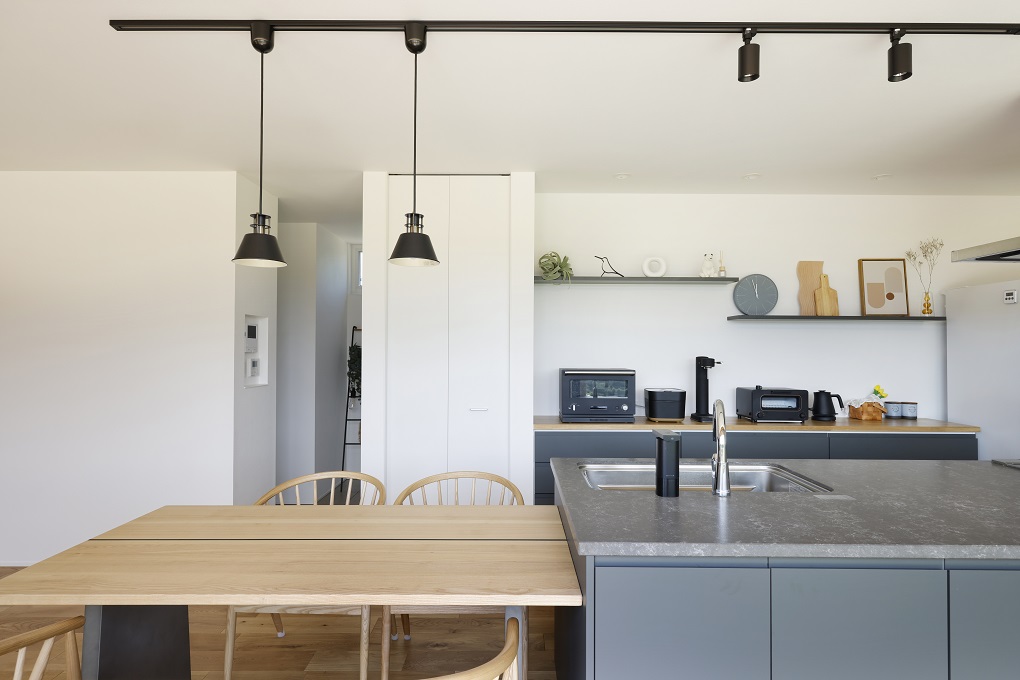 黒いペンダントライトで白い空間を引き締めている。
