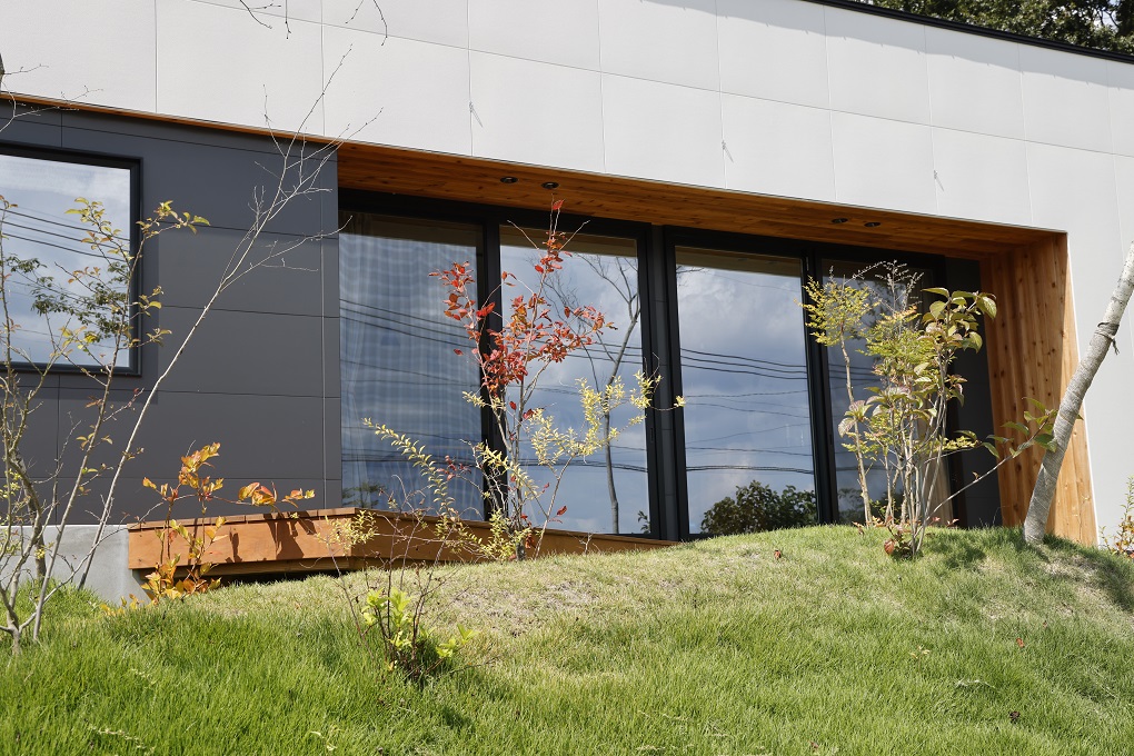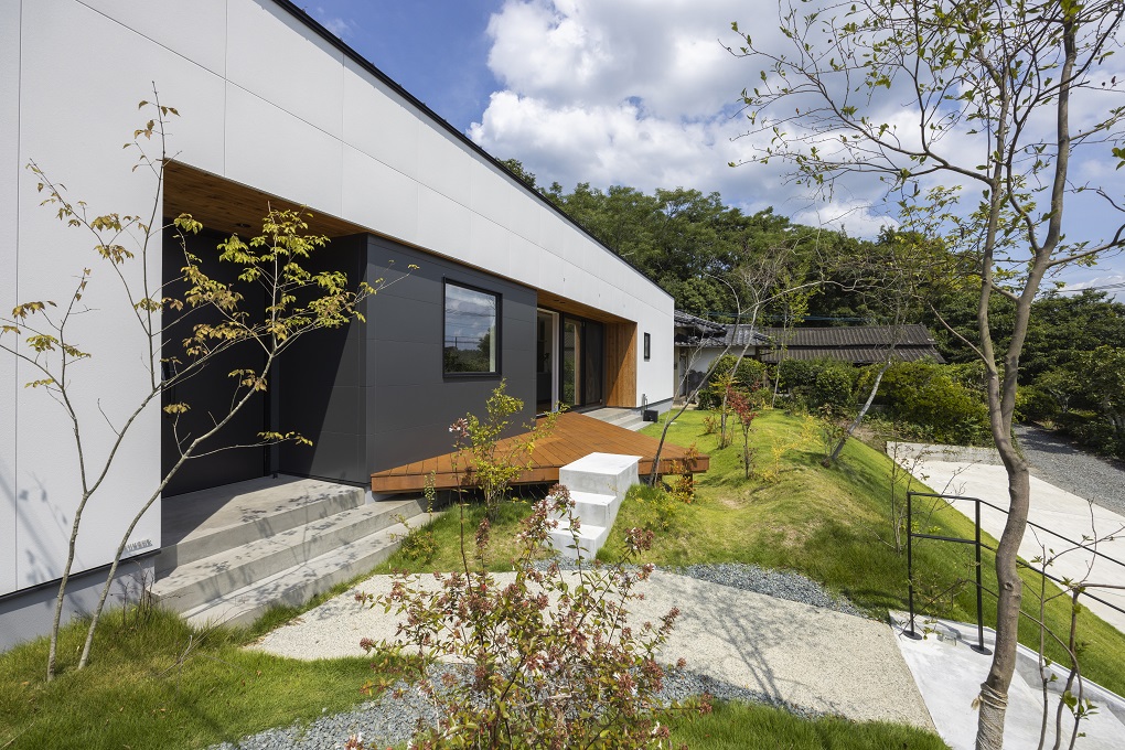 のどかな自然に囲まれた傾斜地の一角にポンと置かれたように建つシャープなプロポーションの平屋。