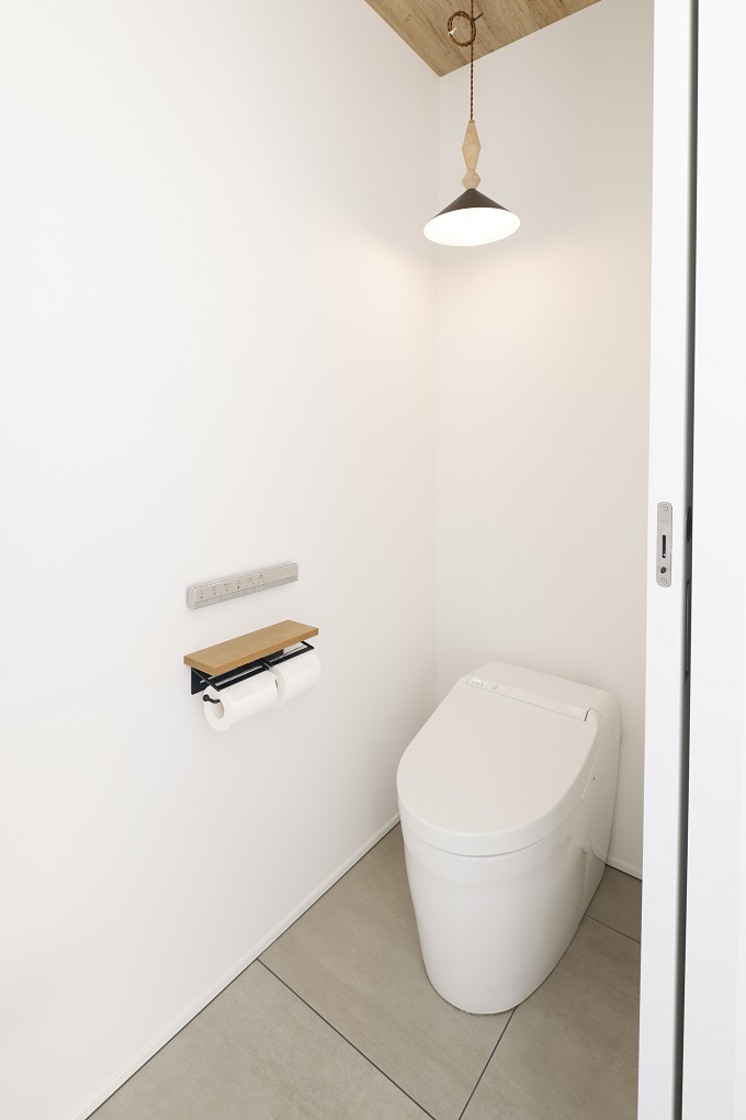 トイレや脱衣などの水回りはシックな色の磁器タイル貼り。掃除もしやすく、白でまとめられた空間を清潔に保てる。