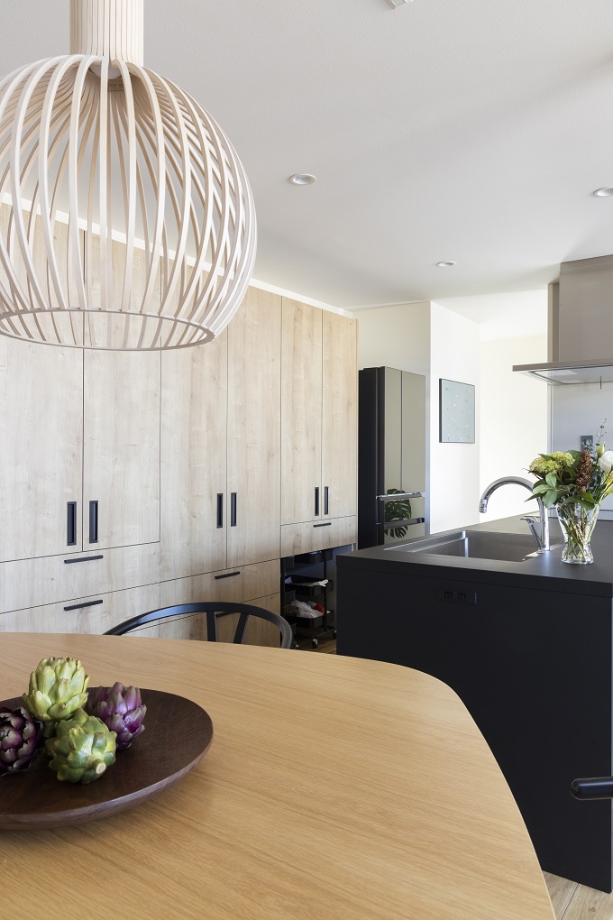 キッチンには大容量の背面収納を設置。ストック食材などを収め、オープンキッチンをすっきり保っている。