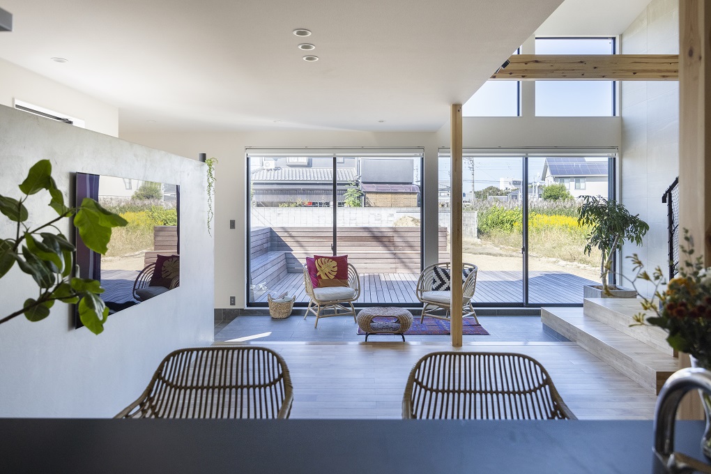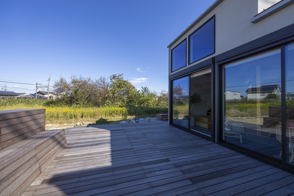 大窓とウッドデッキで室内外がシームレスにつながるように計画。