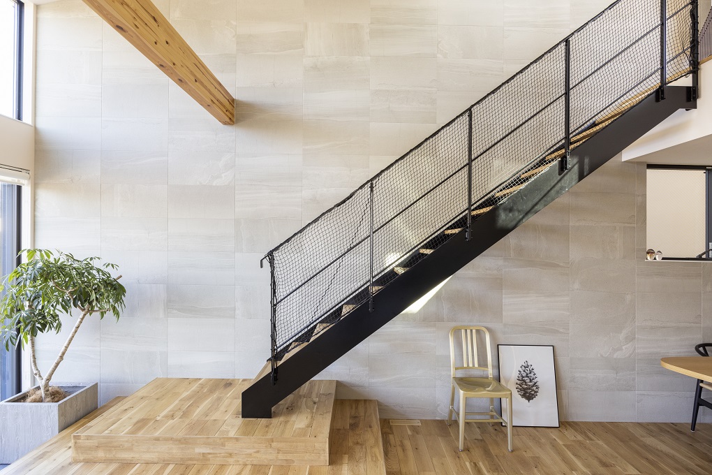 大家族のメインスペースともいえるLDK。賑やかな笑い声が響き、暮らしを満喫できる空間。黒いアイアンの階段はオープンな空間のアイストップに。